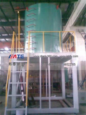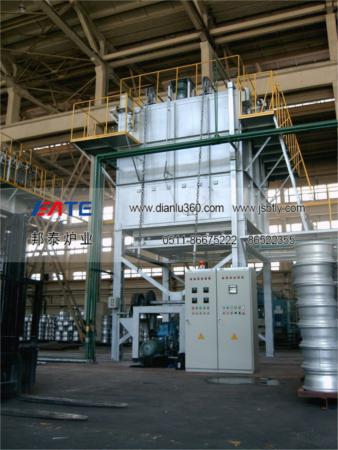 結構:立式鋁合金淬火爐的結構具有熱風循環通道和攪拌風機,使爐內熱風在導流板的作用下定向循環,保溫終了時爐內金屬溫差。淬火水槽置于加熱爐正下方,從而縮短工件淬火轉移時間,提高工件固溶質量。工件料架進出和爐門啟閉均為電控,操作方便。動作間均設有連鎖裝置,可靠。本爐主體為立式爐門在下端的加熱爐,加熱元件置于內爐壁,壁的內側裝有活絡門板,它與內壁形成一個氣流循環通道,爐的頂部置有一個大風量的軸流式風扇和道流結構,構成熱風循環系統。爐底門由四走輪和驅動機構組成一個啟閉裝置,爐底門與加熱爐殼用砂封密封。工件料架進出爐膛靠升降裝置實現。它由爐內吊鉤連接吊桿上通過向爐外的環形鏈和卷揚機等組成。在地平面鋼軌上置有一裝料小車,可載料架進入裝料和卸料。